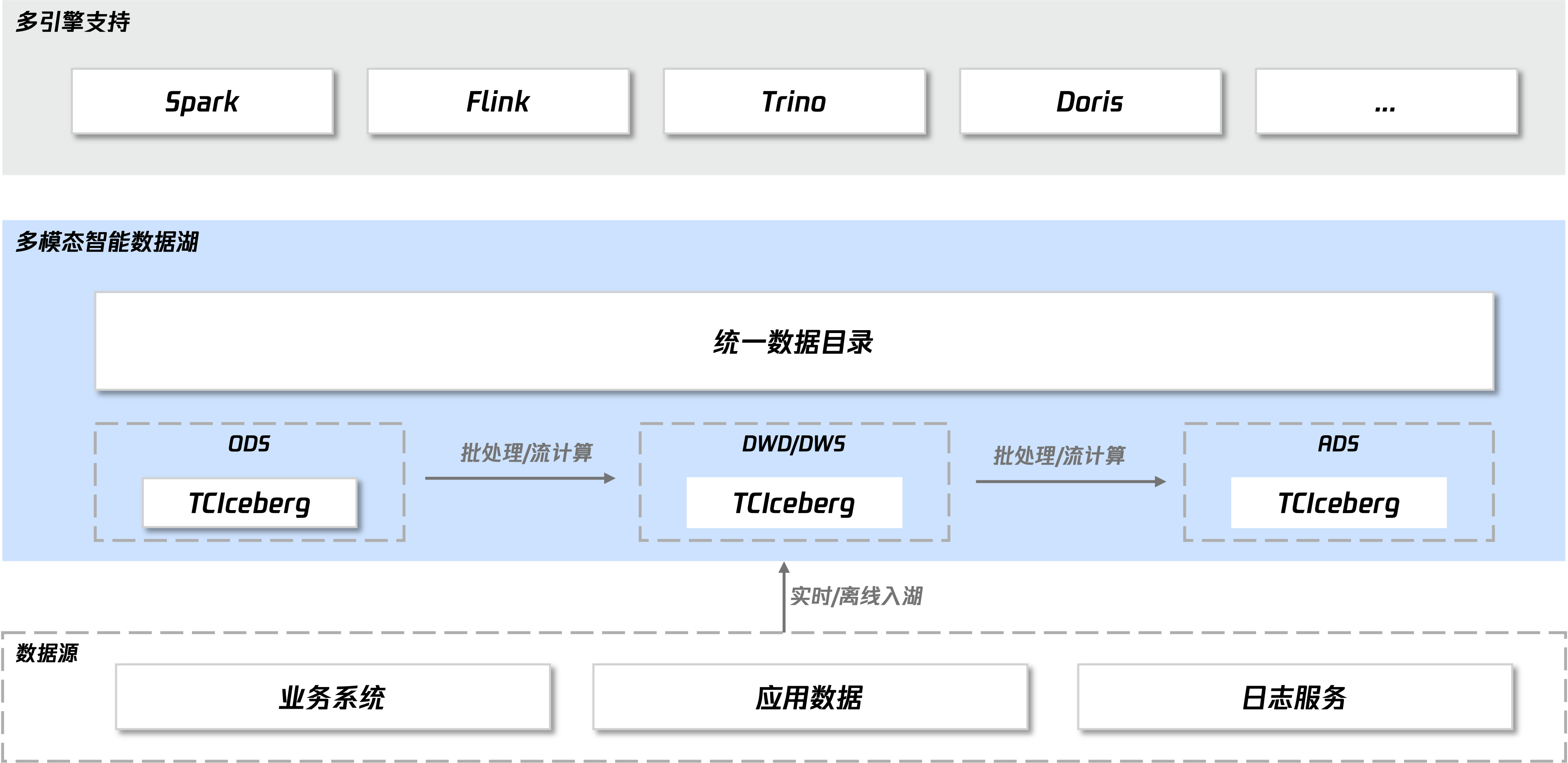 基于统一数据湖构建多场景应用,如基于 Spark 的批处理、基于 Flink 实时链路、基于 TCHouse 的高性能分析等,解决传统架构下离线、实时、交互分析多套数据体系割裂问题。同时通过统一元数据整合 LakeHouse 数据资产、提供智能数据优化、加速等服务,可大幅提升客户数据维护及使用效率。