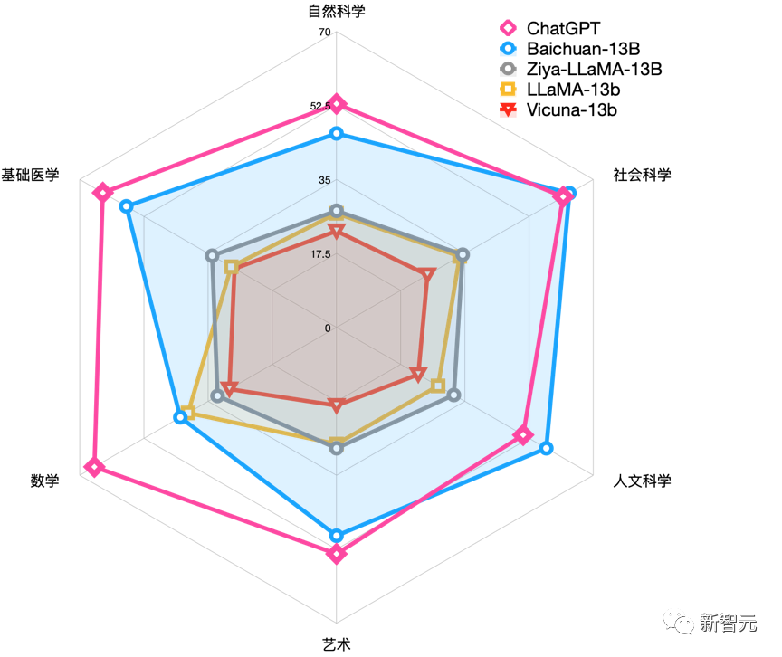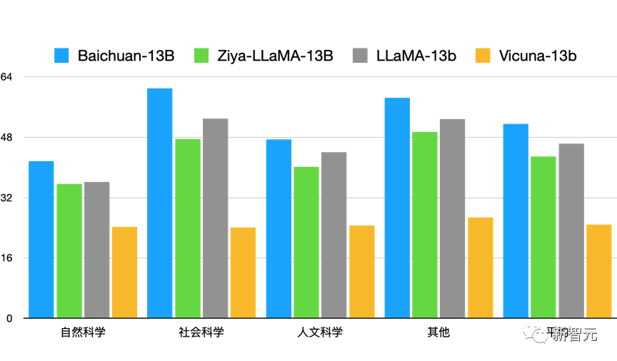 中文领域,在权威评测C-EVAL中,Baichuan-13B性能一骑绝尘,在自然科学、医学、艺术、数学等领域大幅领先LLaMA-13B、Vicuna-13B等同尺寸的大语言模型,在社会科学、人文科学等领域甚至超越了ChatGPT。