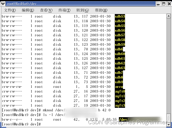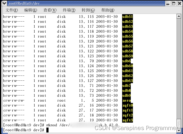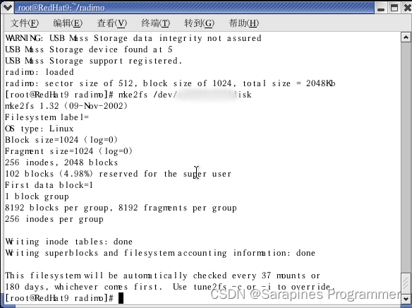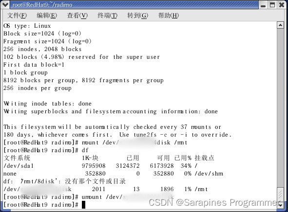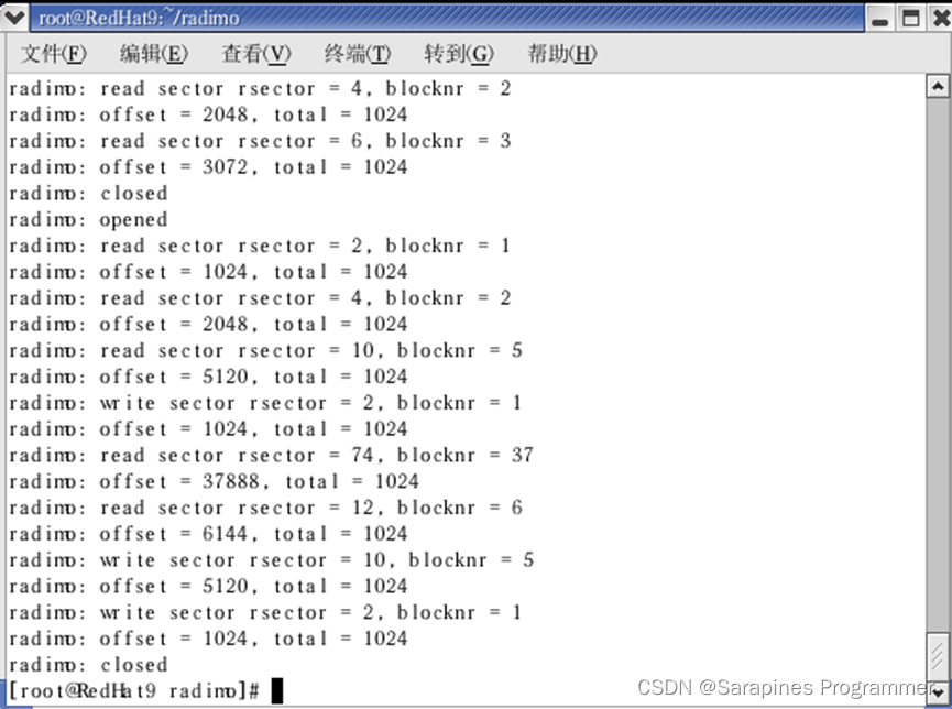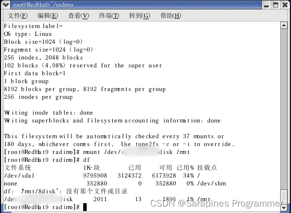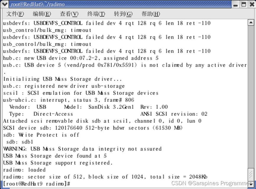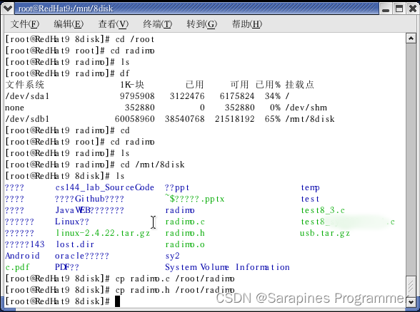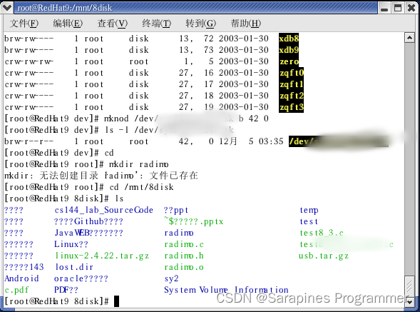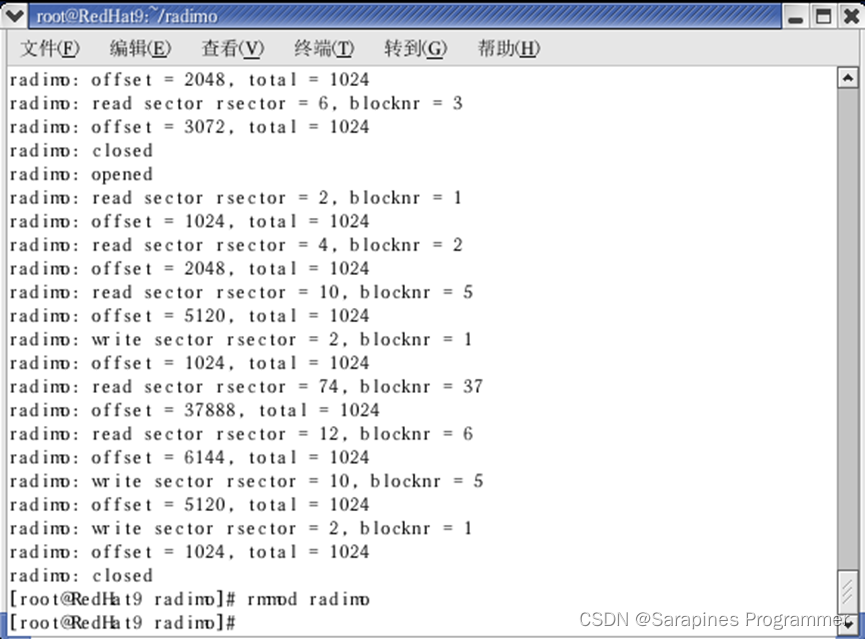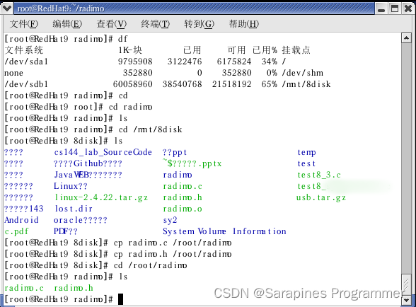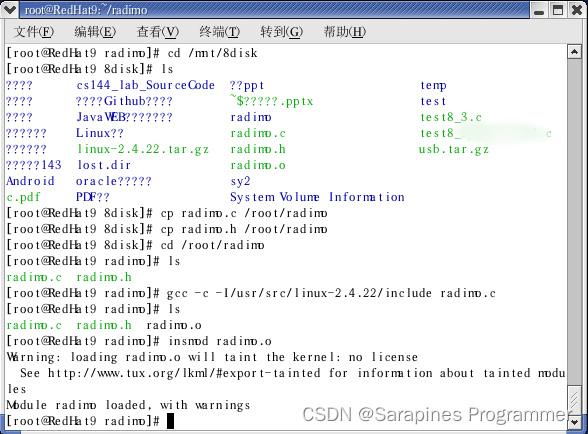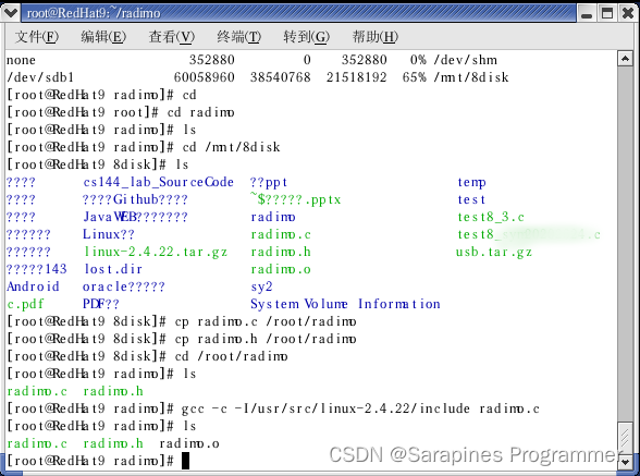1.输入 cd /dev,进入dev目录输入ls,可以看到所有的设备文件,再输入ls -l,可以看到设备文件的细节. 2.输入mknod /dev/xxxdisk b 42 0命令建立一个块设备文件,名字是my_disk,主设备号是42,次设备号是0并输入命令 ls -l /dev/ xxxdisk查看是否成功的建立此文件. 3.进入项目二挂载的8disk目录,copy radimo.c和radimo.h放在/root/radimo目录下并进入该目录查看. 4.输入gcc -c -I/usr/src/linux-2.4.20-8/include radimo.c编译生成radimo.o即为驱动程序. 5.输入insmod radimo.o加载模块,并且输入dmesg查看其容量为2M. 6.输入mke2fs /dev/xxxdisk使用ext2格式化这个设备. 7.输入mount /dev/xxxdisk /mnt在系统中挂载该磁盘,输入命令”df”查看设备细节可见新建立的设备磁盘被挂载在/mnt中. 8.输入umount /dev/xxxdisk卸载磁盘,输入”dmesg”查看日志,可见断开连接后的日志信息与源代码中的信息匹配. 9.最后输入rmmod radimo卸载该驱动程序.