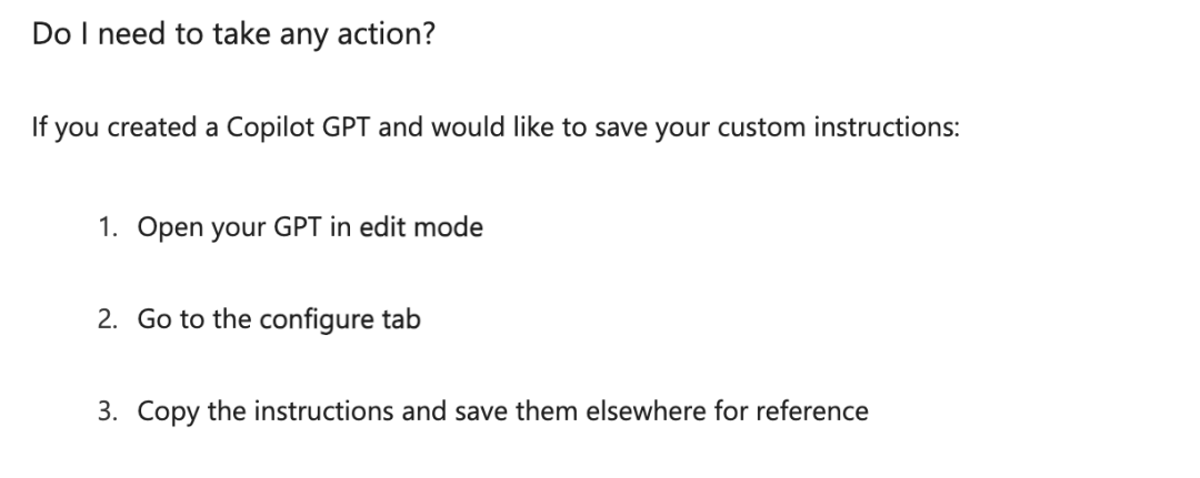 由于所有数据都会被销毁,微软还向使用 Copilot GPT Builder 的用户支招,以保存已创建的 Copilot GPT 的自定义指令: