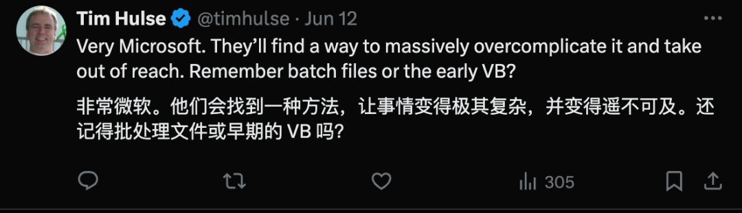 网友 Tim Hulse 毫不客气地指出,「这很符合微软的风格,他们总是设法让事情变得极其复杂」,甚至还拿出了陈年旧事来「鞭尸」。