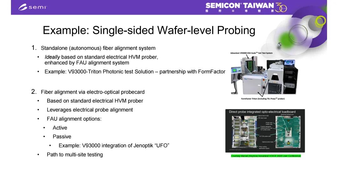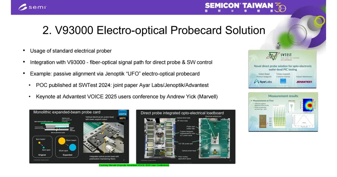 2. V93000与Jenoptik“UFO”被动对准方案:2024年SWTest会议上,Advantest联合Ayar Labs、Jenoptik发布该方案POC(概念验证);2025年Advantest VOICE用户大会上,Marvell的Andrew Yick以该方案作主题演讲;方案采用集成光电负载板与单片扩展光束探针卡,降低对准复杂度并提升测试效率;