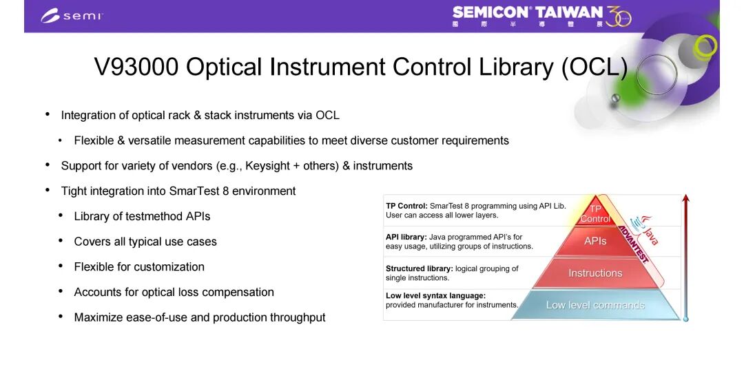 在光仪器集成领域,核心目标是将光仪器紧密集成到自动测试设备(ATE)中,实现高扩展性、高密度与高吞吐量,同时建立标准化的设备配置,包含自动校准与诊断功能;Advantest的行动是与领先的仪器及连接器厂商合作,通过“光仪器控制库(OCL, Optical Instrument Control Library)”实现设备集成,并结合内部技术积累优化集成流程。