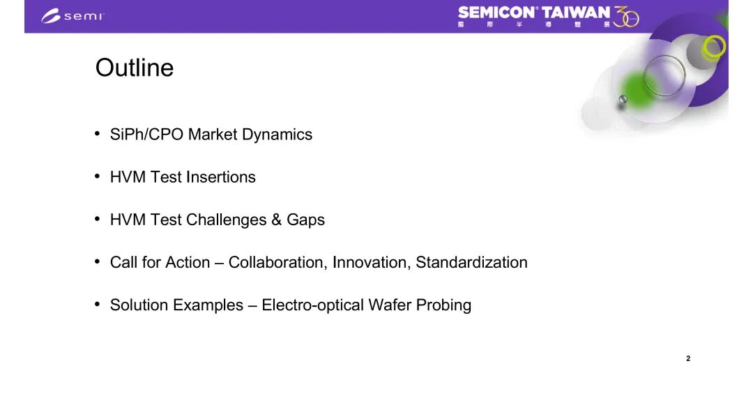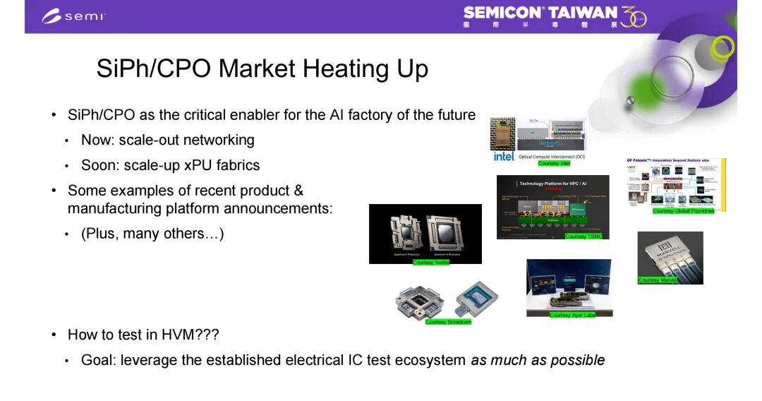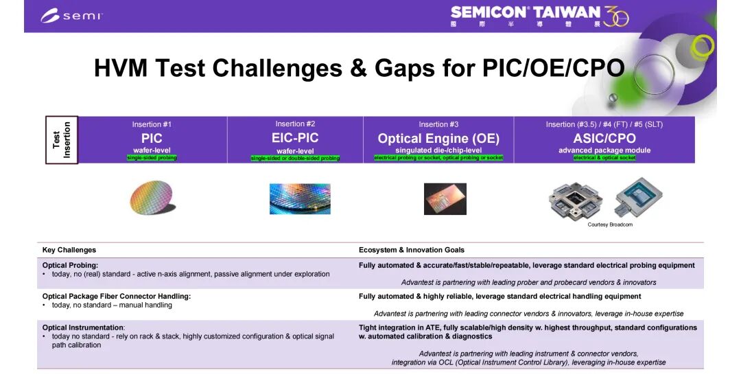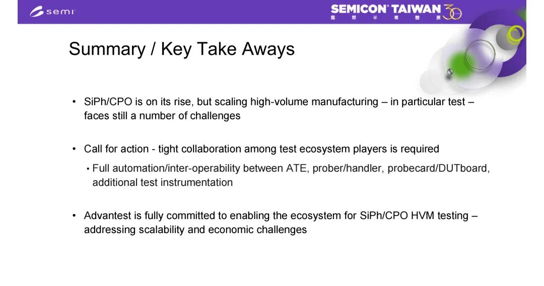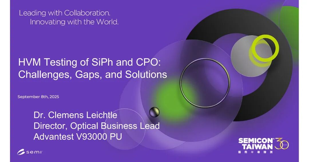 2025年9月8日,在台湾国际半导体展(SEMICON TAIWAN)上,Advantest光学业务负责人Clemens Leichtle博士发表了题为“HVM Testing of SiPh and CPO: Challenges, Gaps, and Solutions”(硅光子与共封装光学的大规模量产测试:挑战、差距与解决方案)的技术演讲。演讲聚焦SiPh与CPO在HVM阶段的测试痛点,以“最大化复用成熟电IC测试生态”为核心目标,系统阐述了测试流程、关键挑战、生态建设方向及具体解决方案,旨在推动测试生态的协作、自动化与标准化,为SiPh/CPO的规模化生产提供技术支撑。