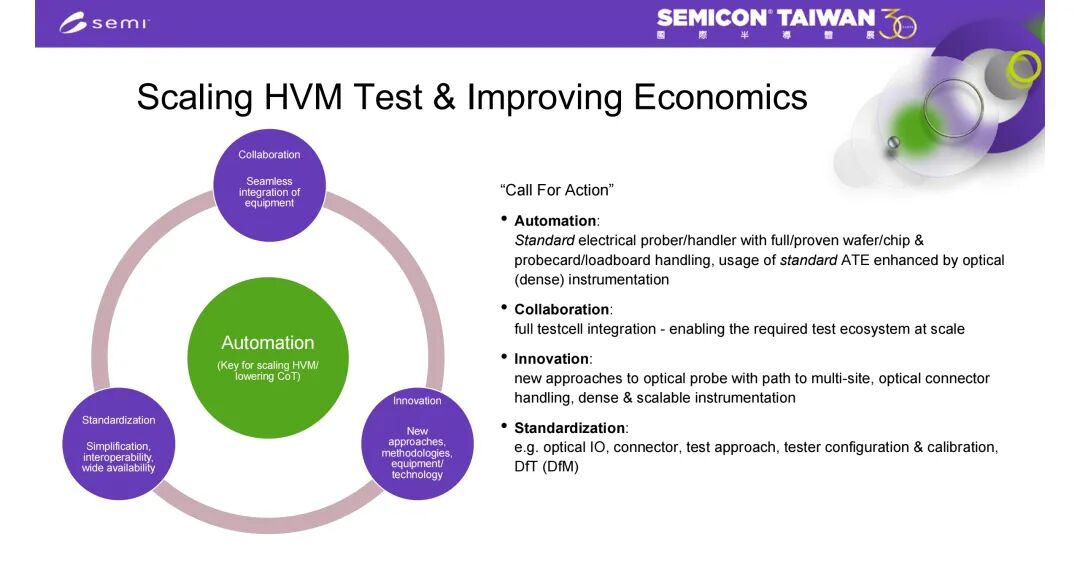 - 自动化:以HVM扩展与降低测试成本(CoT)为目标,复用标准电测试设备的成熟自动化能力(如晶圆处理、探针卡更换),延伸至光测试环节;