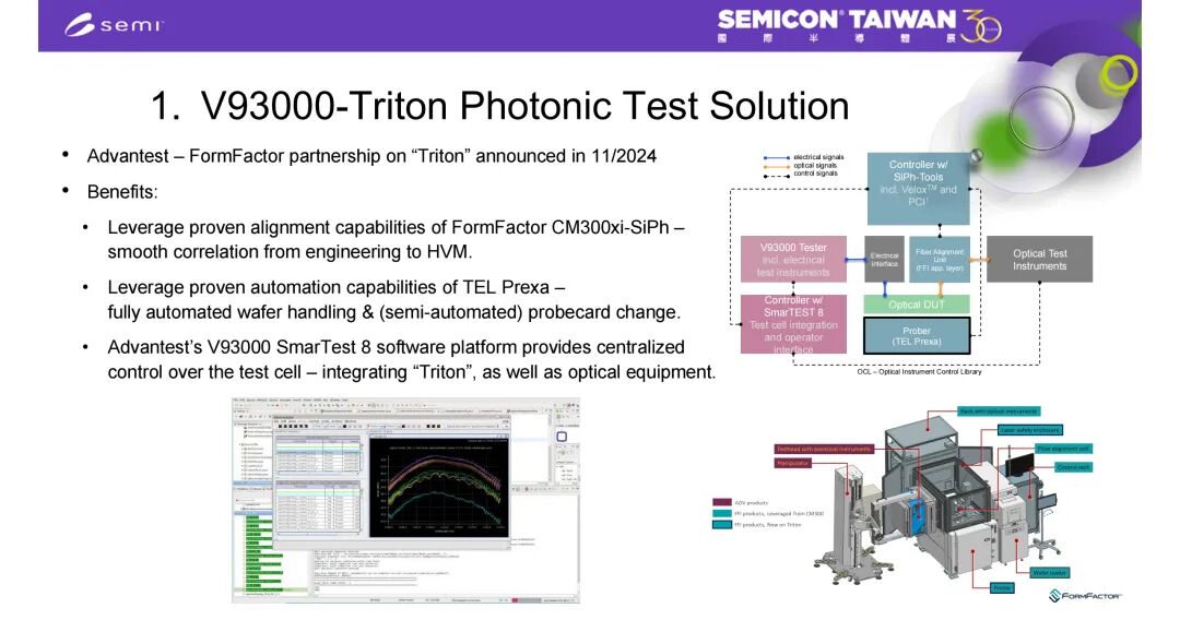 1. V93000-Triton光子测试方案(与FormFactor合作):基于标准电HVM探针台,复用成熟电探针对准技术,支持主动/被动FAU(光纤对准单元)对准,具备多站点测试扩展潜力,实现“电-光”测试协同,为规模化测试提供硬件支撑;