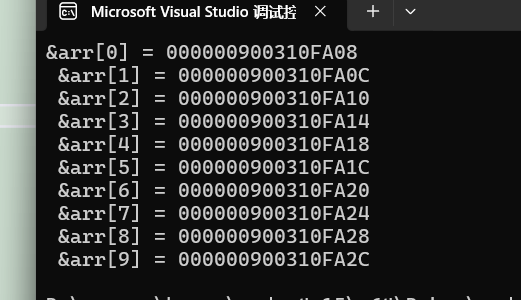 运行这串代码之后我们可以发现,数组随着下标的增长,地址是由小到大变化的,并且我们发现每两个相邻的元素之间相差4(因为一个整型是4个字节),所以得出结论:数组在内存中是连续存放的。