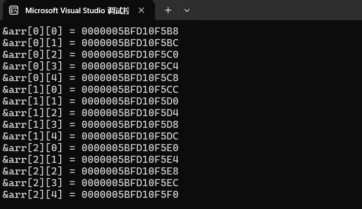 从输出的结果来看,每一行内部的每个元素都是相等邻的,地址之间相差4个字节,跨行位置处的两个元素(如:arr[0][4]和arr[1][0]) 之间也是差4个字节,所以二维数组中的每个元素都是连续存放的。