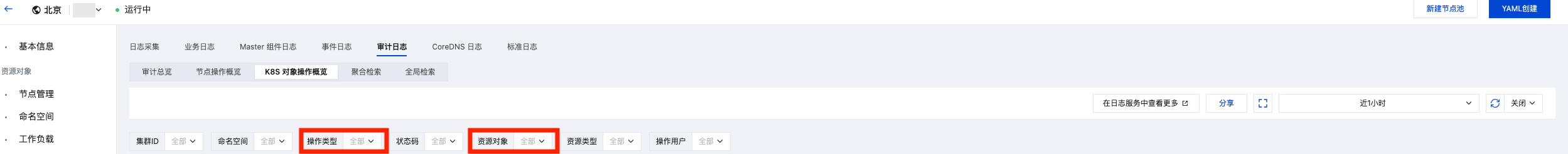 4. 在过滤项中指定需要排查的操作类型和资源对象,如下图所示: