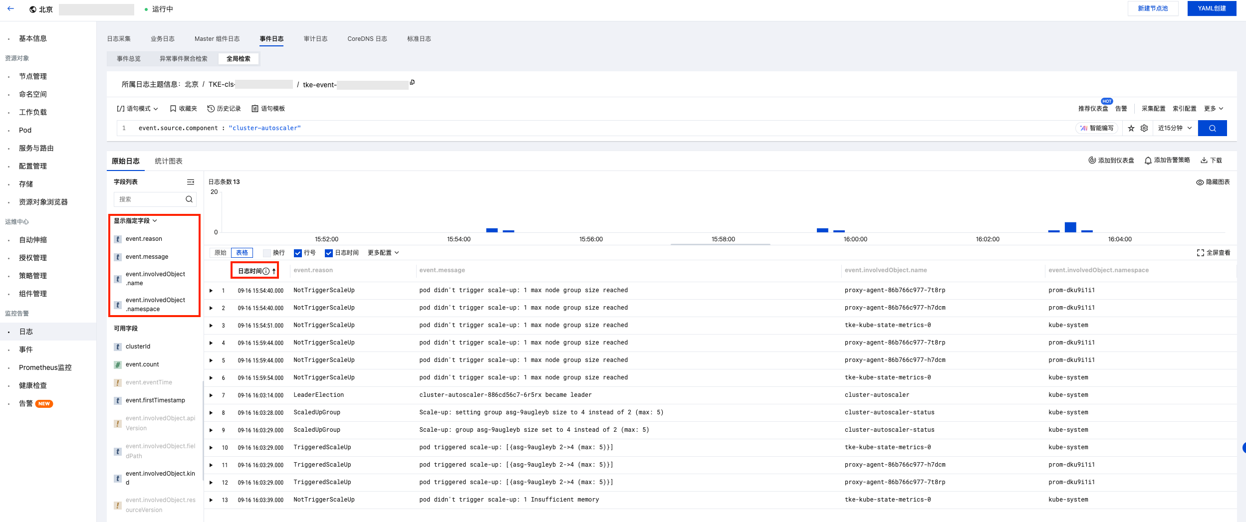 开启了节点池弹性伸缩的集群,CA(cluster-autoscaler)组件会根据负载状况自动对集群中节点数量进行增减。如果集群中的节点发生了自动扩(缩)容,用户可通过事件检索对整个扩(缩)容过程进行回溯。