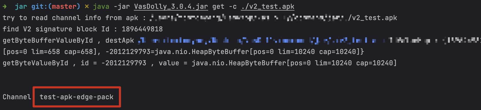 即可触发边缘函数,动态地将渠道信息注入到指定位置,其中 comment 为您在 创建用于触发渠道信息写入的边缘函数 中定义的渠道参数。以 v2-VasDolly 方式为例,可以使用 VasDolly 工具来读取动态注入的渠道信息: