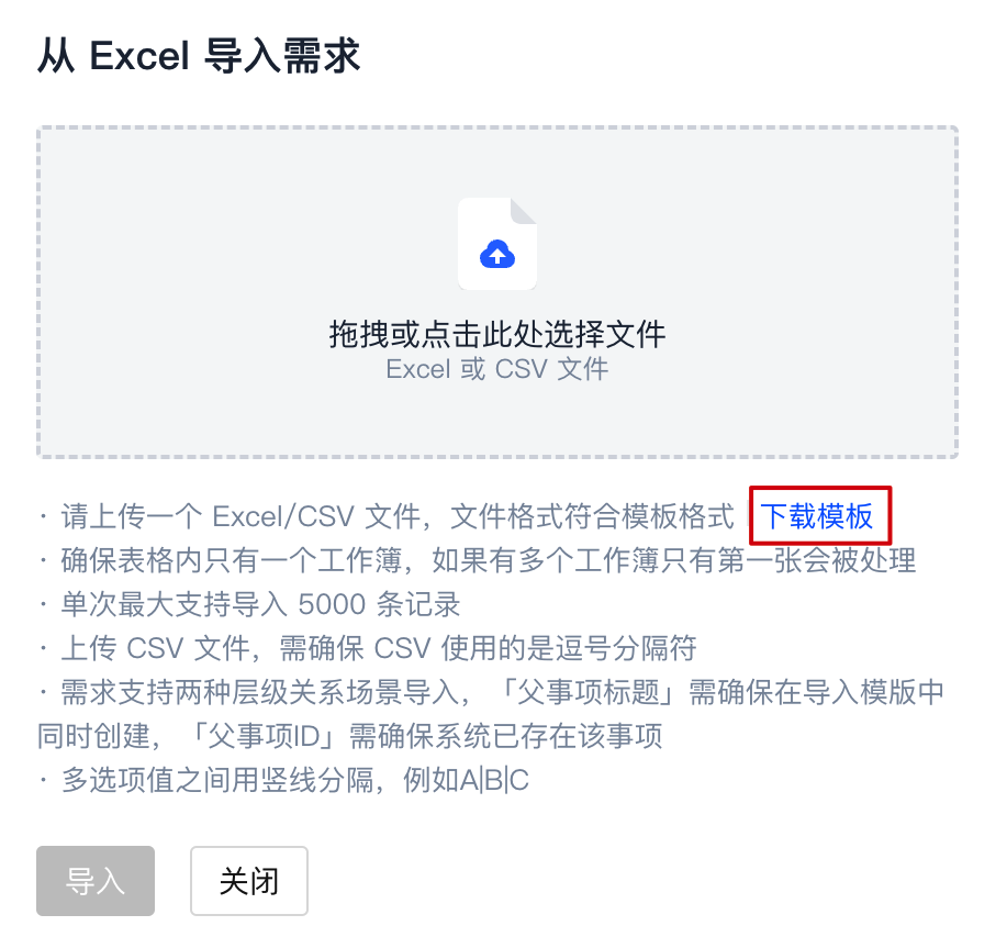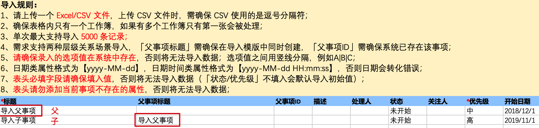 需求支持导入父子级关系,导入模板中“父事项标题”和“父事项ID”属性见下文说明。