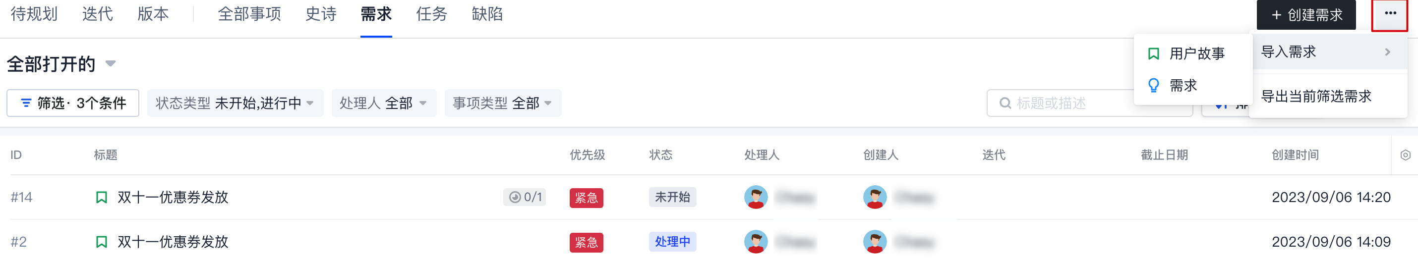1. 在需求列表页右上角菜单内选择导入需求 > 需求。