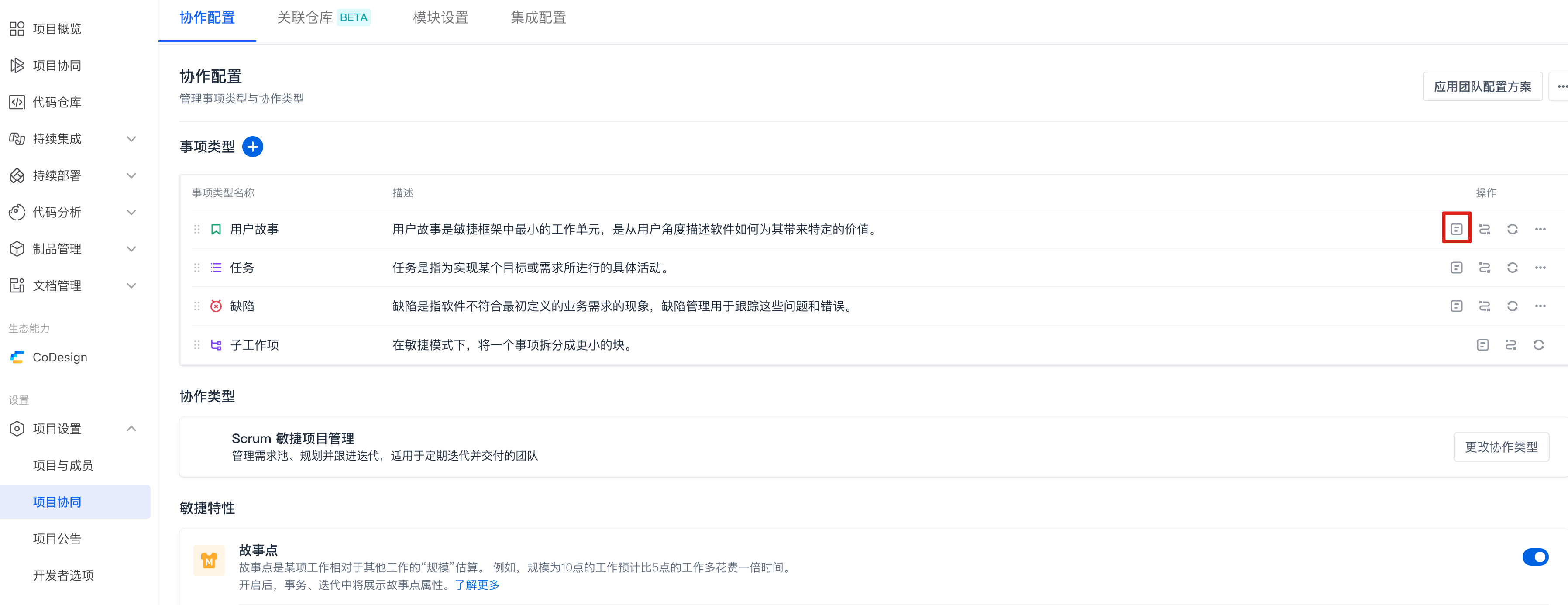 项目管理员单击项目左下角的项目设置 > 项目协同,选择需要添加描述模板的事项类型。您可以为不同的事项类型设计差异化描述模板以满足团队在不同场景下的事项内容撰写需求。