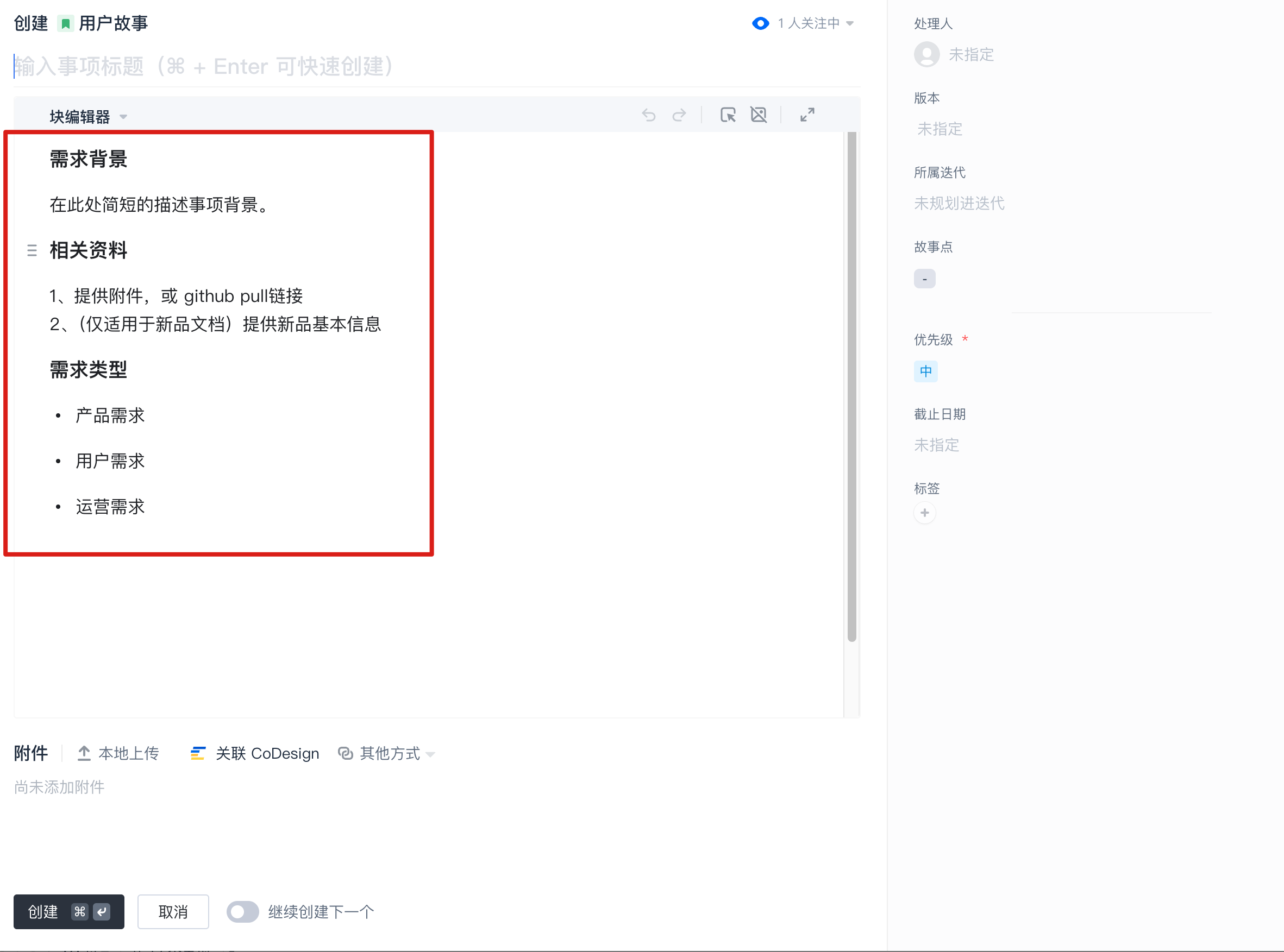 待新的方案生效后,在项目协同中创建需求后便可以看到上文中创建的事项描述模板。