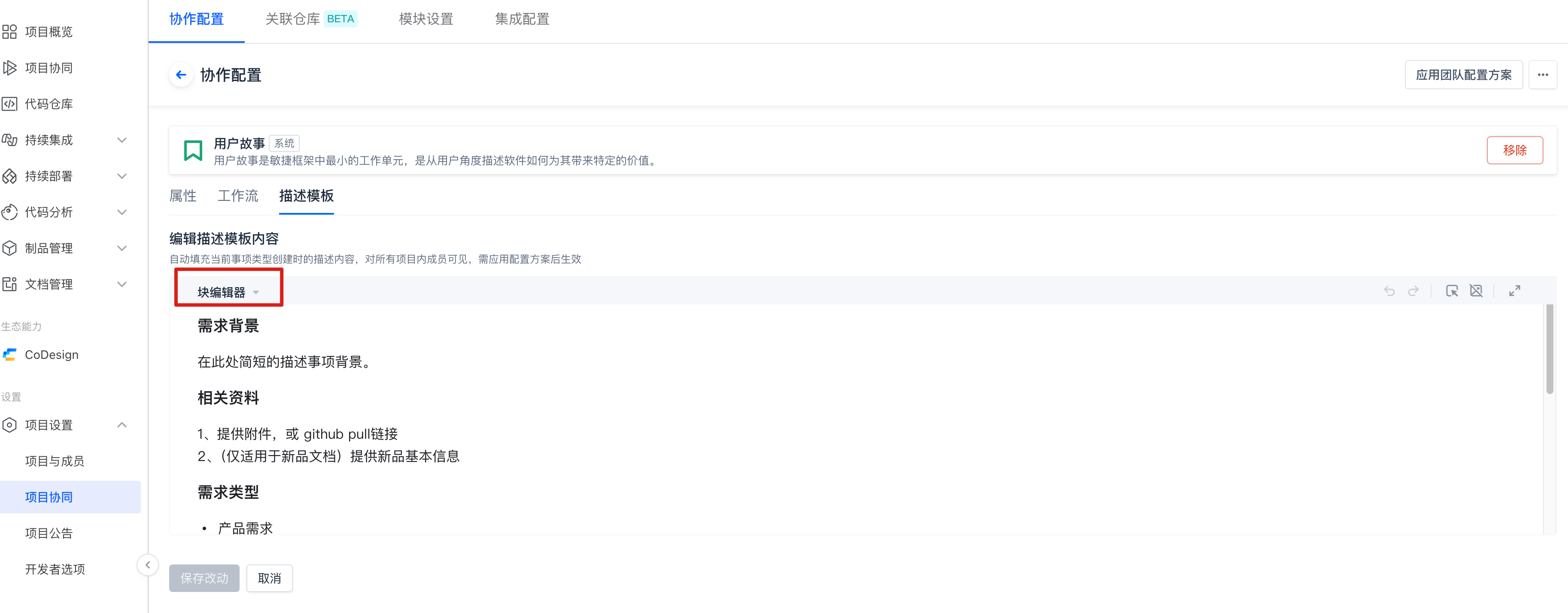 单击属性后,在描述模板中设计事项协作中常用的描述模板。目前支持块编辑器和富文本模板模式,可以自行切换。