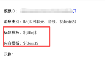 控制台设置模板 ID 后,会默认填充 V2TIMOfflinePushInfo 的 title 和 desc 字段内容给模板标题和内容,格式如下: