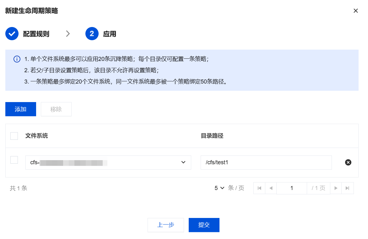 创建生命周期策略后,单击下一步,选择 Turbo 文件系统,并填写指定路径,并单击提交。