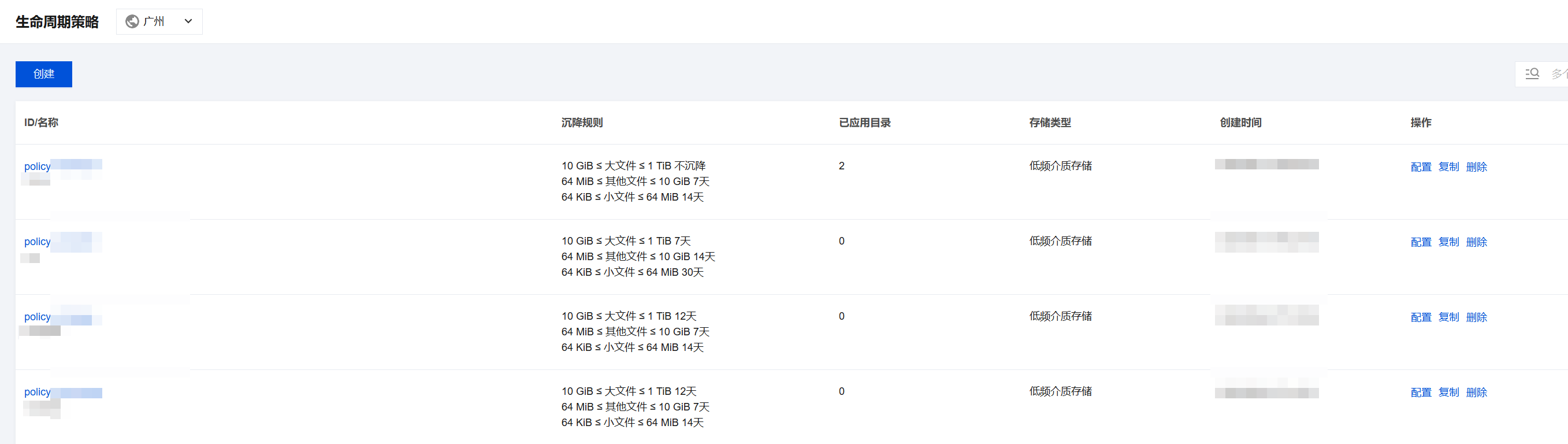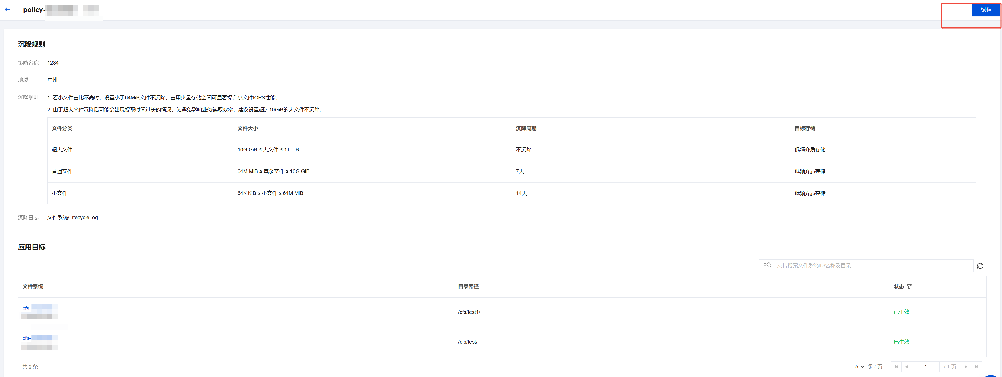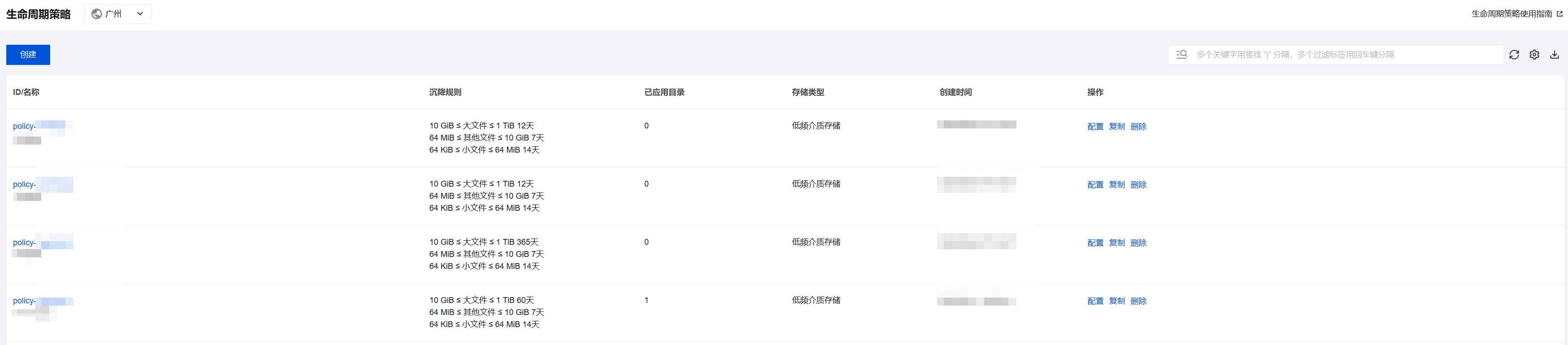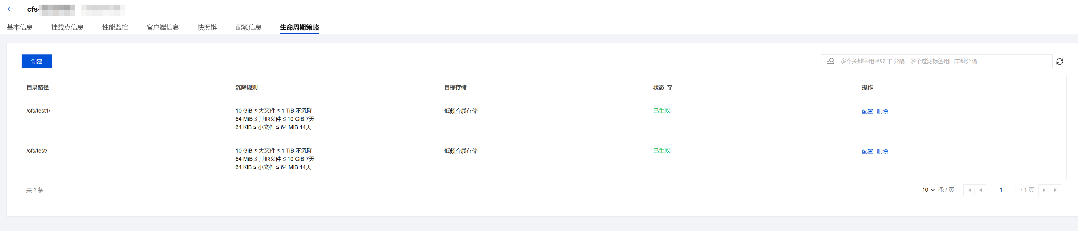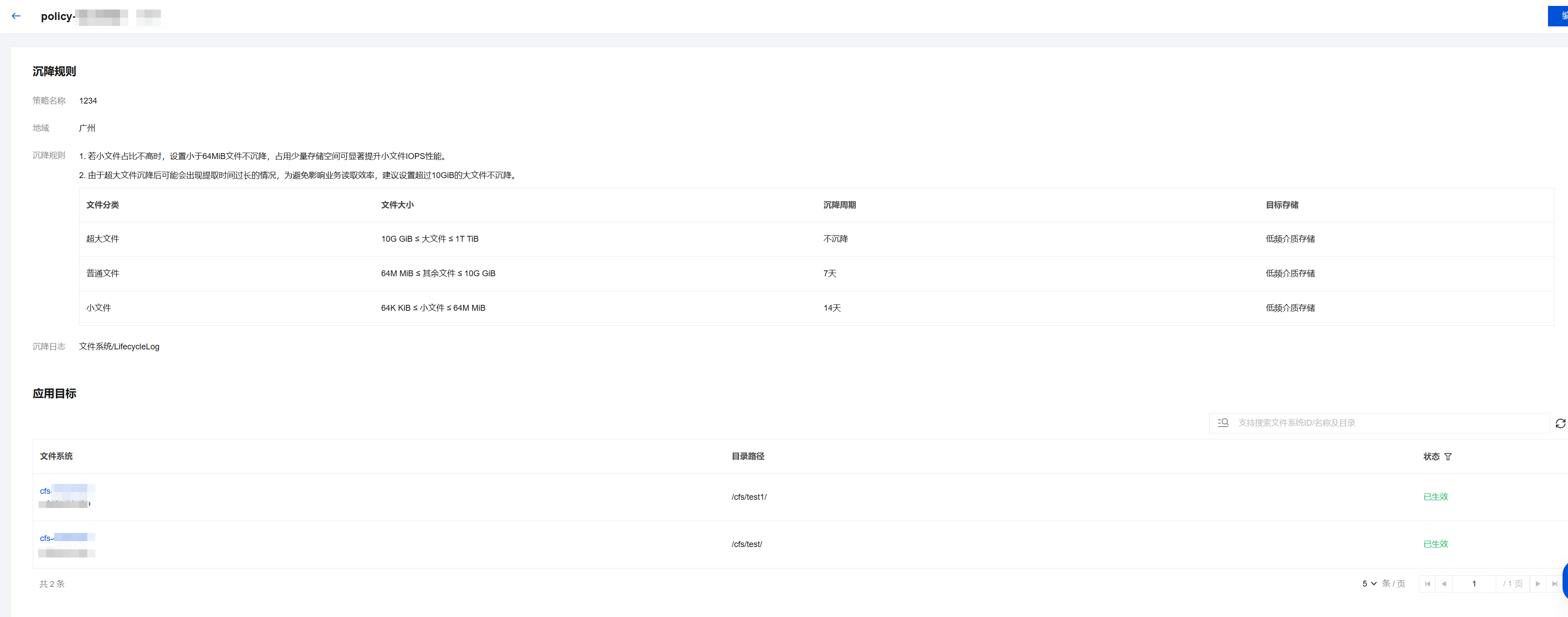 2. 进入文件生命周期策略子页面,查看当前已生效的生命周期策略。