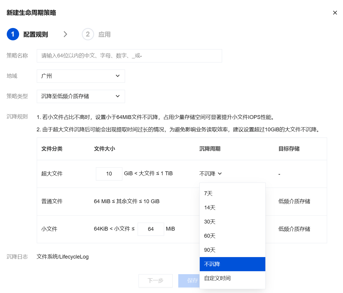 2. 根据实际业务需要指定时间周期、文件大小的生命周期管理策略,并单击下一步。