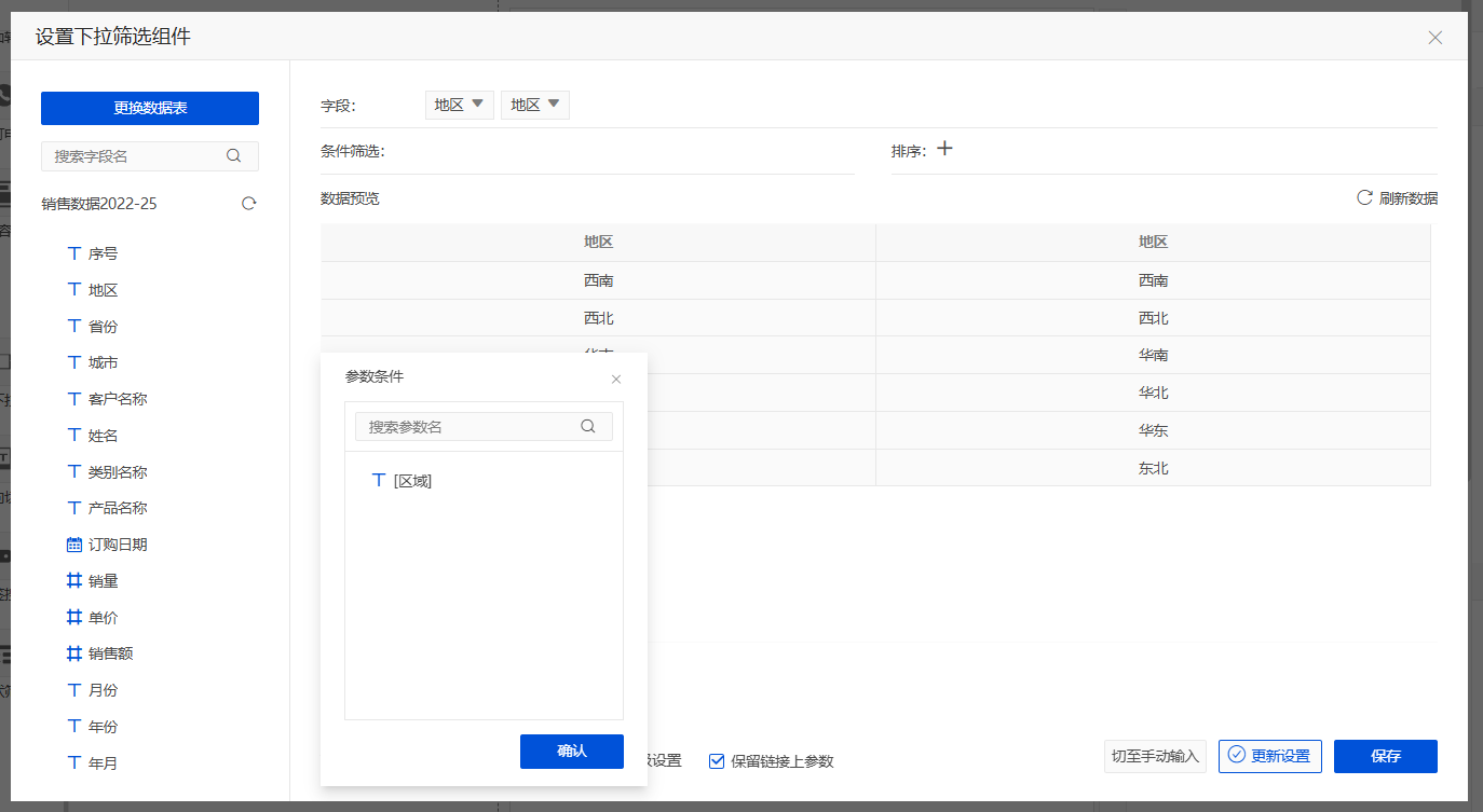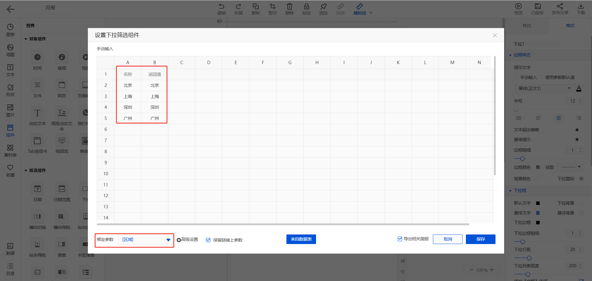 通过下拉组件绑定数据后,通过组件绑定参数,实现同一分析报告通过不同的参数控制显示对应相关的数据。