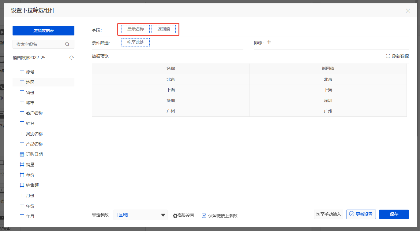 部分组件可以绑定多组数据,那么可以有多级显示名称和返回值。