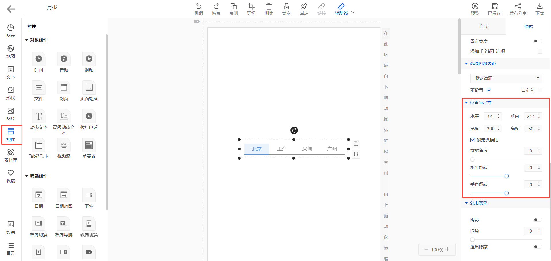 简报制作过程中可以用到各种对象组件,筛选组件,时间组件,视频组件,文件组件,网页组件,日期组件,下拉筛选,横向切换等。满足交互式简报的各种操作需求,使您得简报能有更好的数据表达。