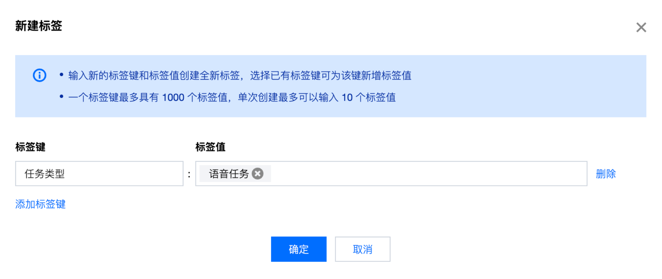 单击新建标签,输入标签键任务类型,标签值语音任务。