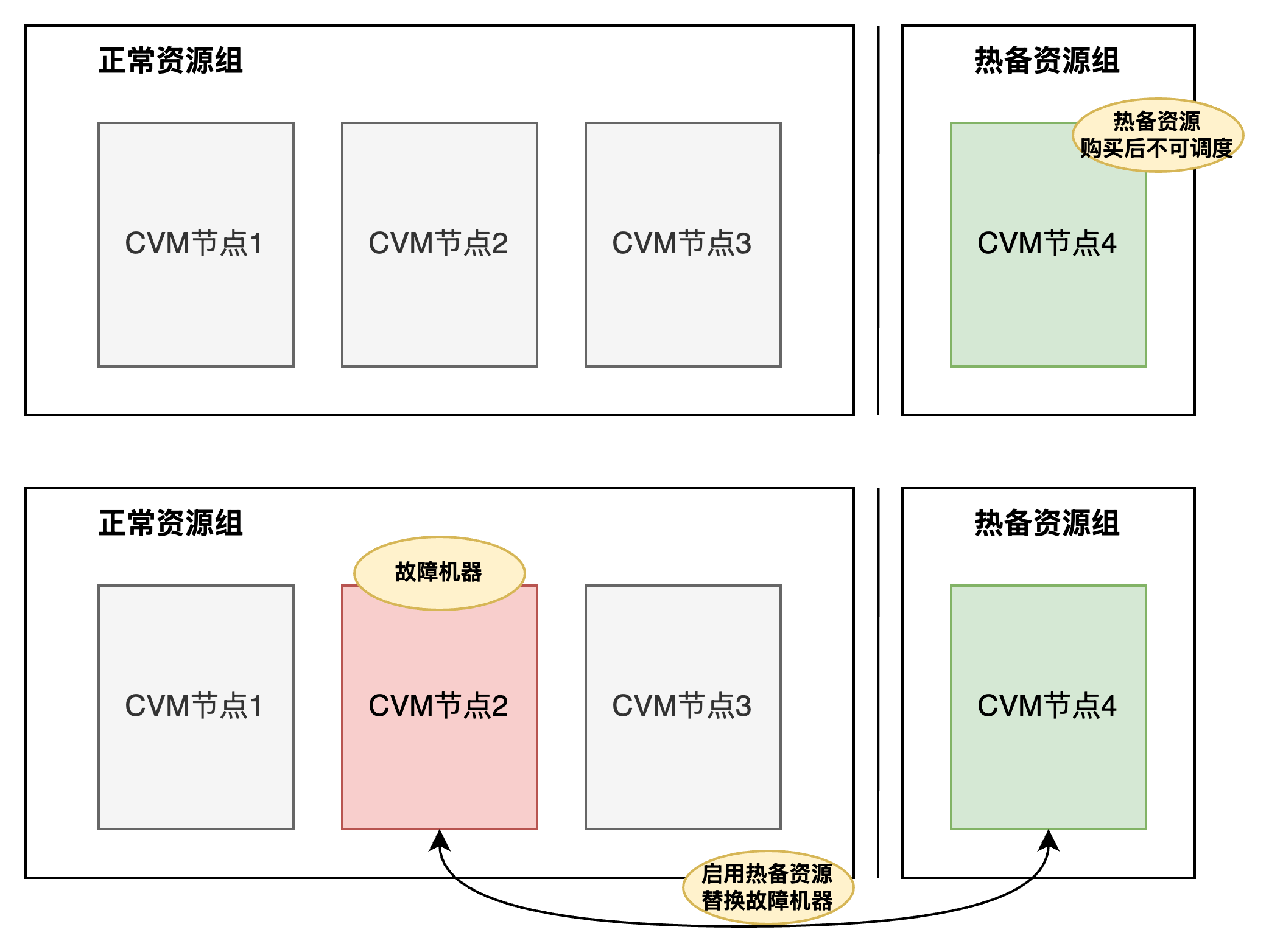 在替换故障机器时,平台从热备资源组中找出与异常节点的实例规格完全一致的CVM机器,显性地移动到出现异常节点的资源组中。同时,修复后的故障机器(被维修成功并恢复可用状态),将自动迁回热备资源组。