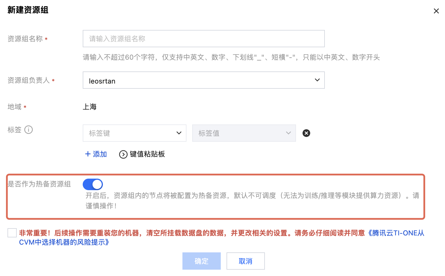 1. 在新建资源组弹窗内,开启按钮将资源组配置为“热备资源组”。创建完成后,热备资源组将以高亮标签的形式显示在资源组列表中。
